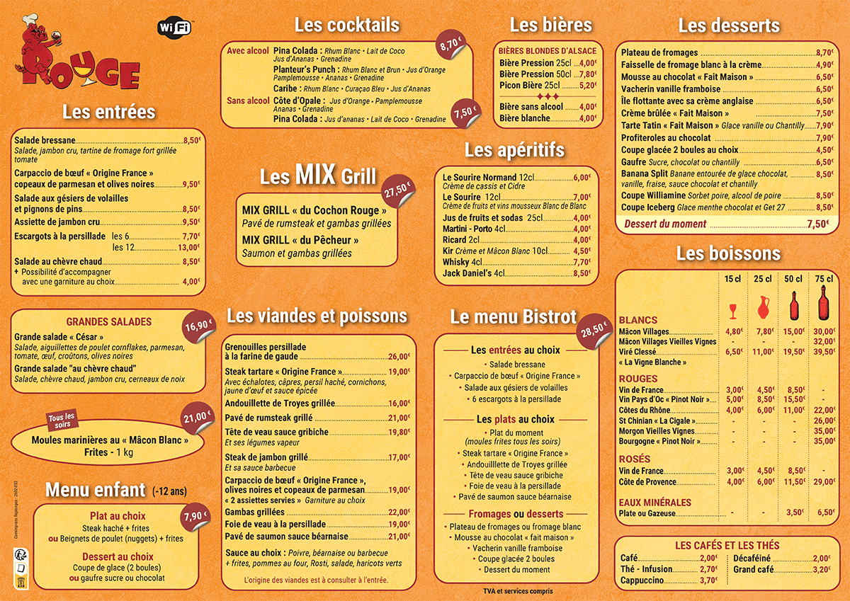 Tous les jours, c’est salade repas, tête de veau, grenouilles et autres surprises… et n’oubliez pas la terrasse à l’arrière lorsqu’il fait beau.
